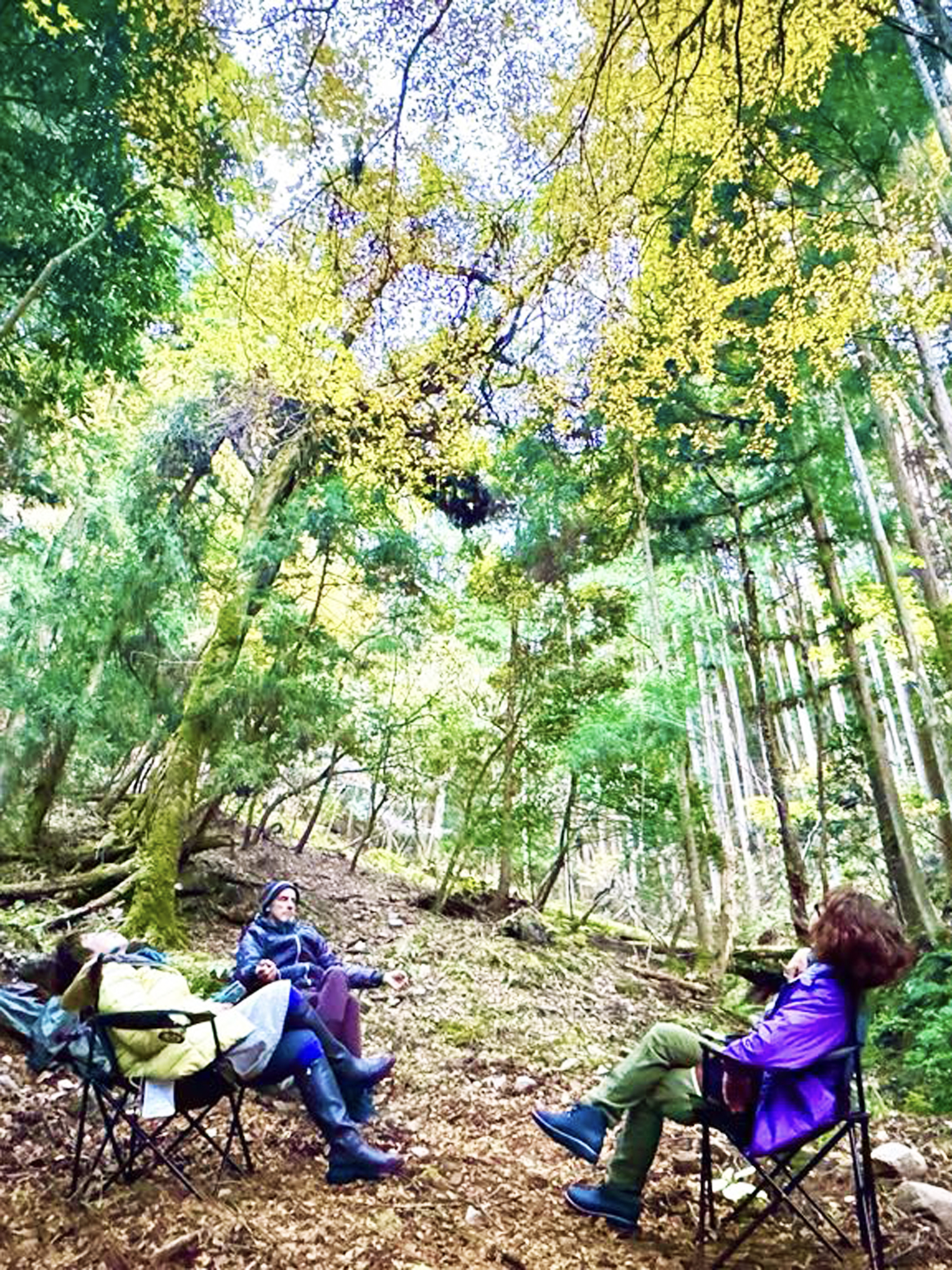 山の霊気を感じながら、ひと時の瞑想を体験。山の香りや、周りの木々や植物をじっくり観察する静かな時間。
