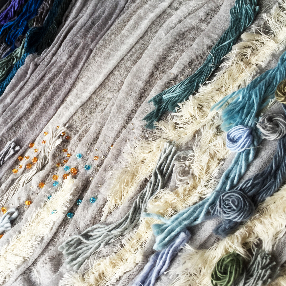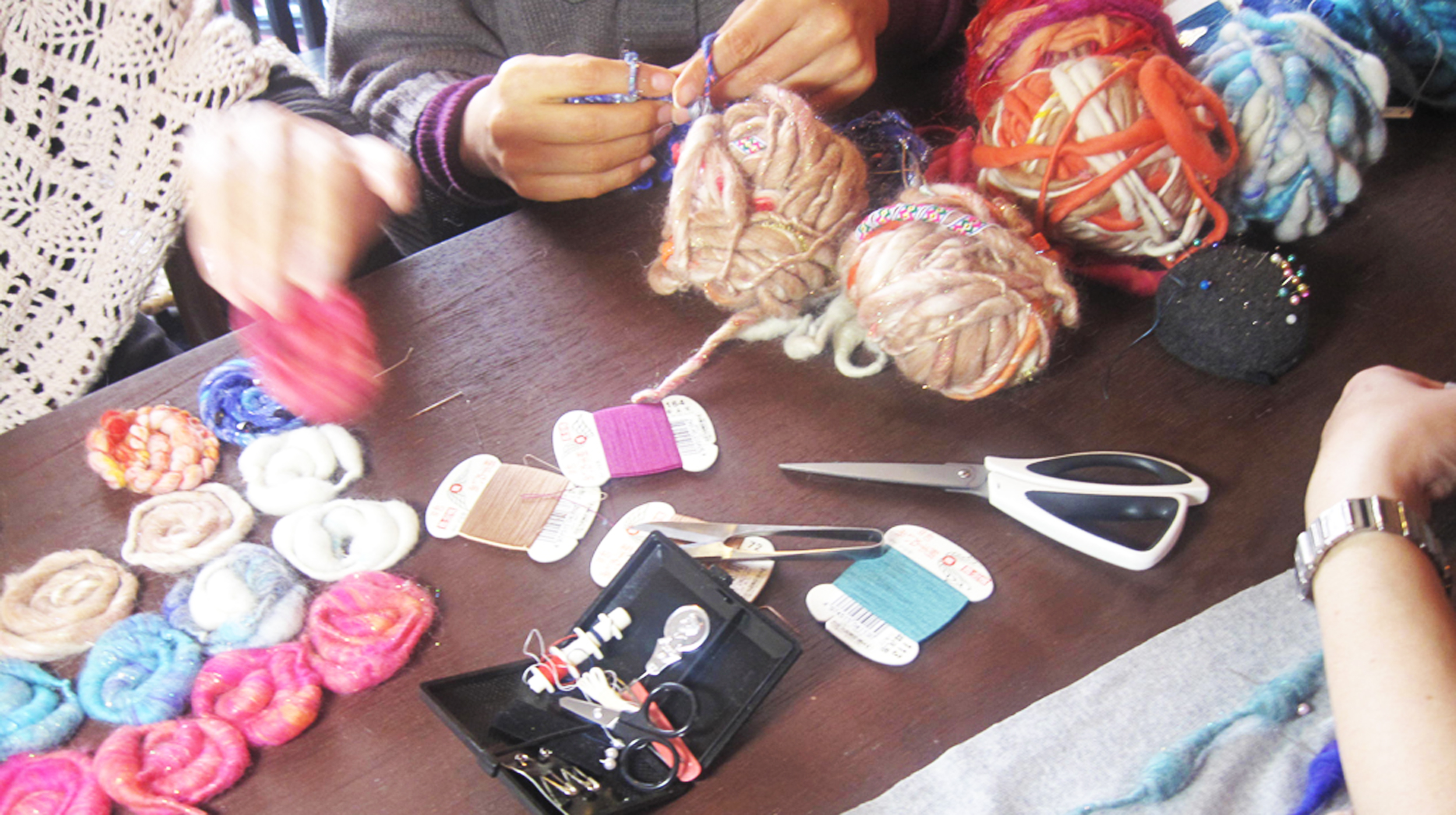 思いもよらない材料の組み合わせ、色の組み合わせ、布を実際に手で触りながら、出来上がりを想像してみる。余計なことを一切考える余裕のない集中した時間・・・それこそが夢中で楽しい時間。シルク古着の着物や手紬の毛糸など、その材料に込められた職人の想いにも触れてみる。日常を離れた別世界に遊ぶ。
